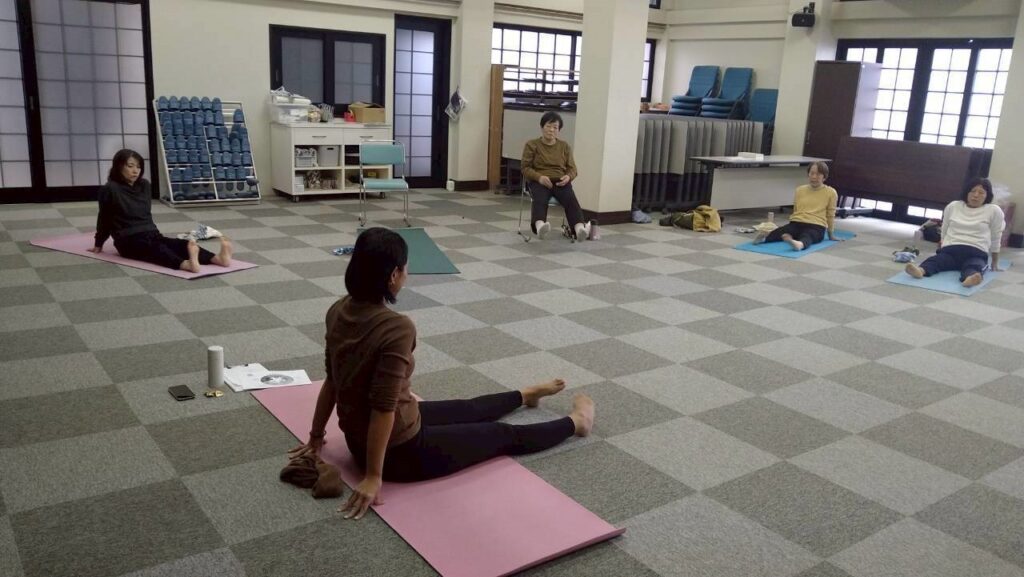ガス抜きのポーズ、橋のポーズ、太陽礼拝のポーズ等々行いました。また、日常生活で足腰を使う、しっかり歩く、塩辛い味、黒豆、黒ゴマ、昆布、ひじきなど黒い食材を取り入れると良いとの事でした。